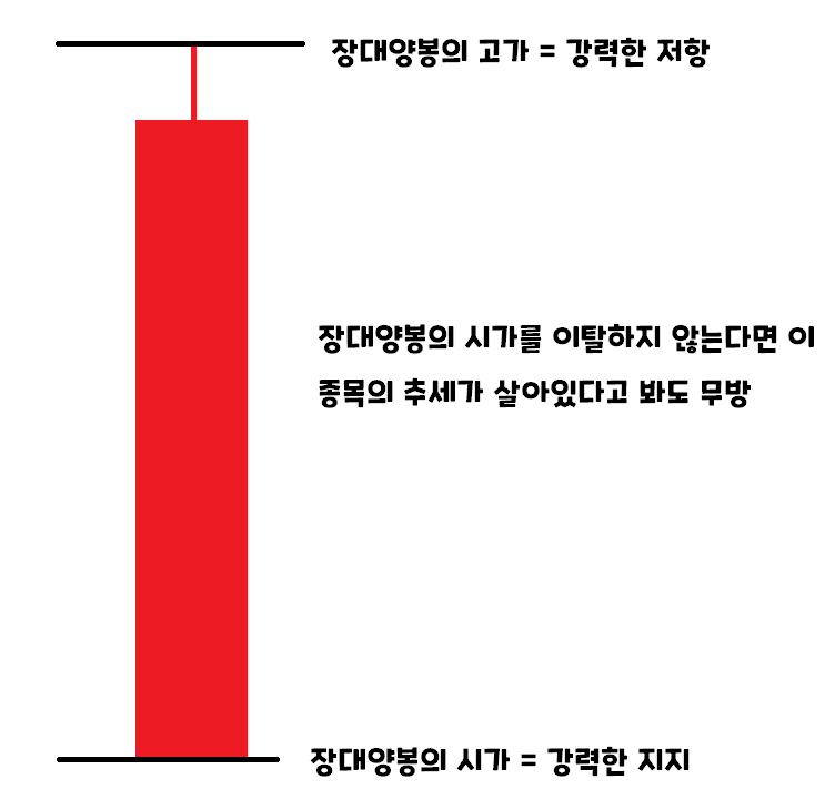 - 장대양봉의 시가는 강력한 지지 역할을 합니다. 만약 이 종목이 진짜 200% 300% 큰 대시세를줄